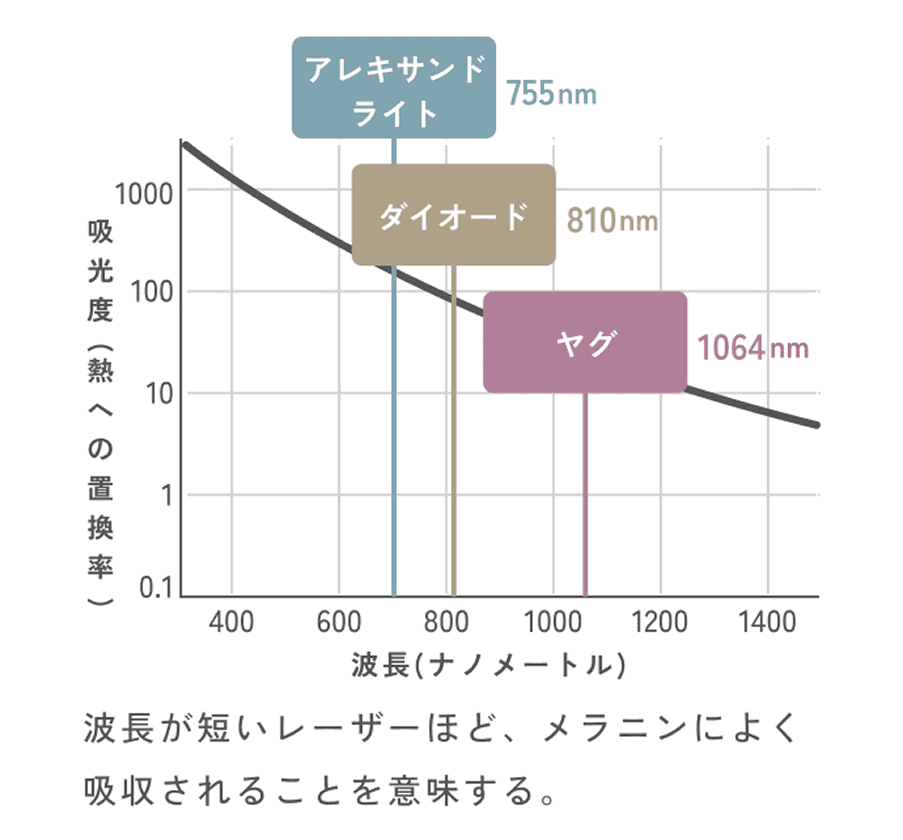 波長が短いレーザーほど、メラニンによく吸収されることを意味する。