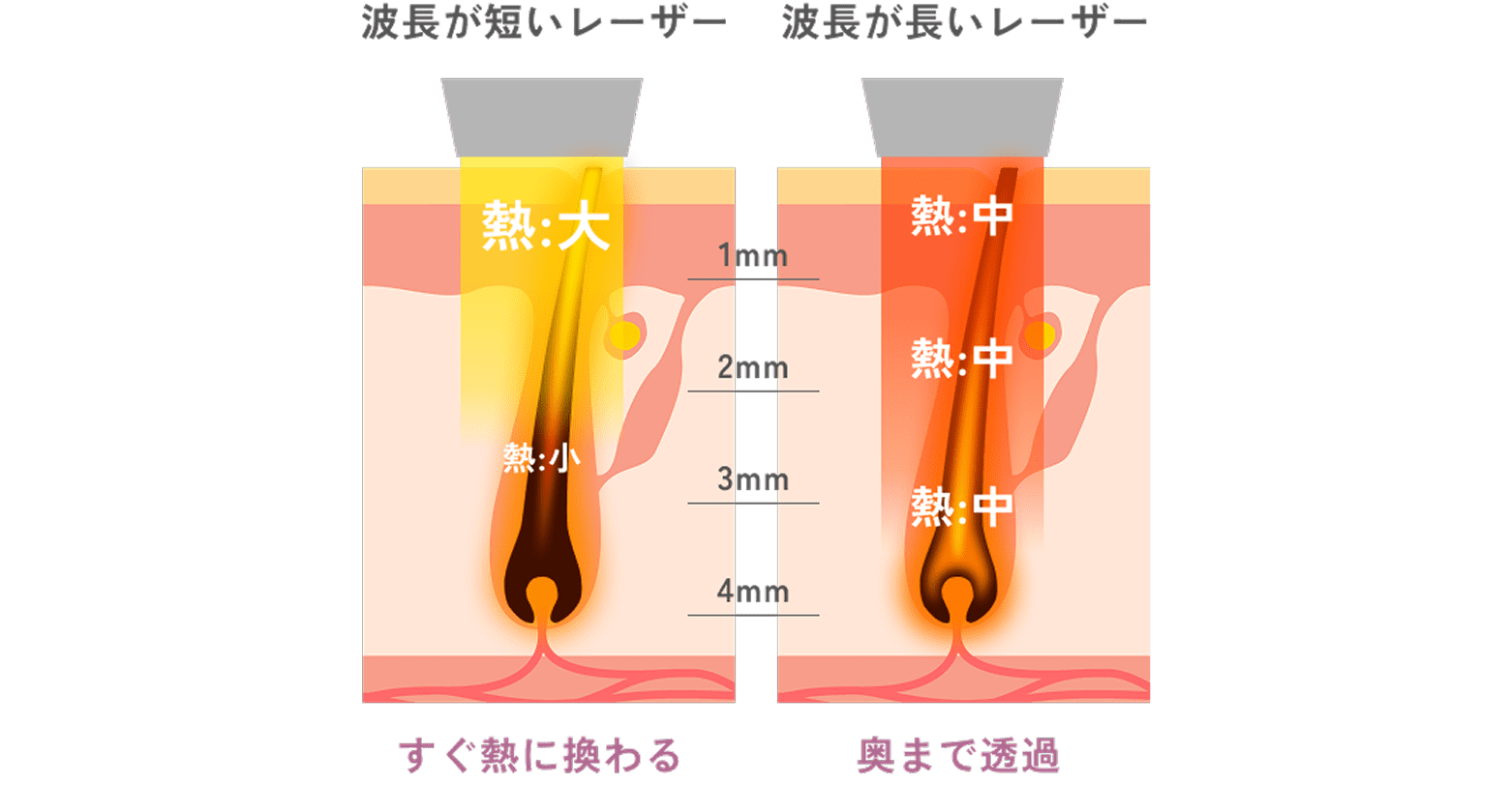 逆に波長が長いレーザーは、毛根にぶつかってもすべては吸収されず、一定量が透過していきます。そして透過した光は毛根を突き進みながら熱を生じていきます。