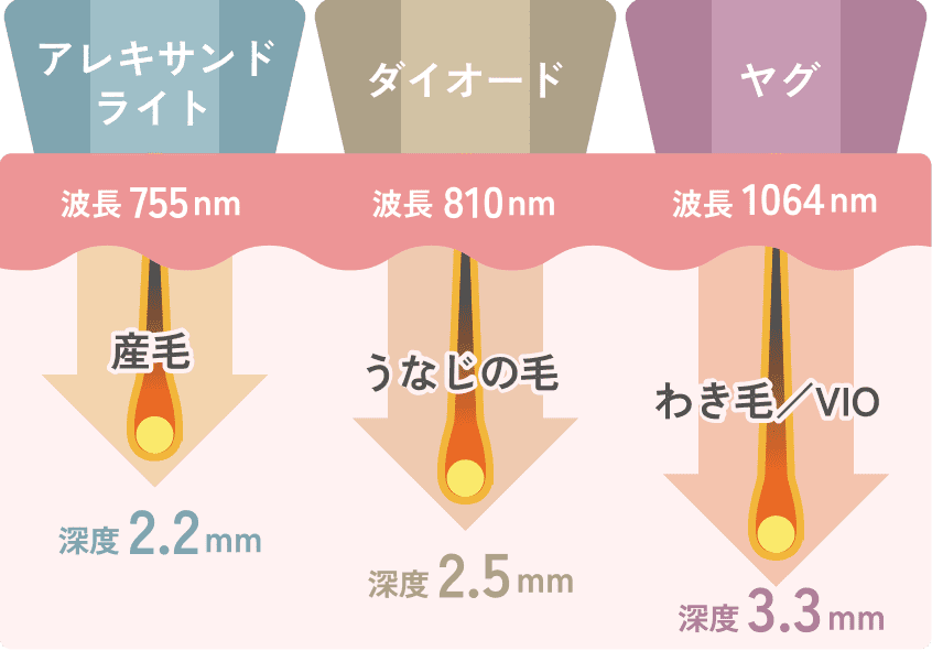 3つのレーザーはそれぞれ「得意な毛質」が違います。どんな毛質が得意なのか、またその他の特長について、レーザー別に解説します。