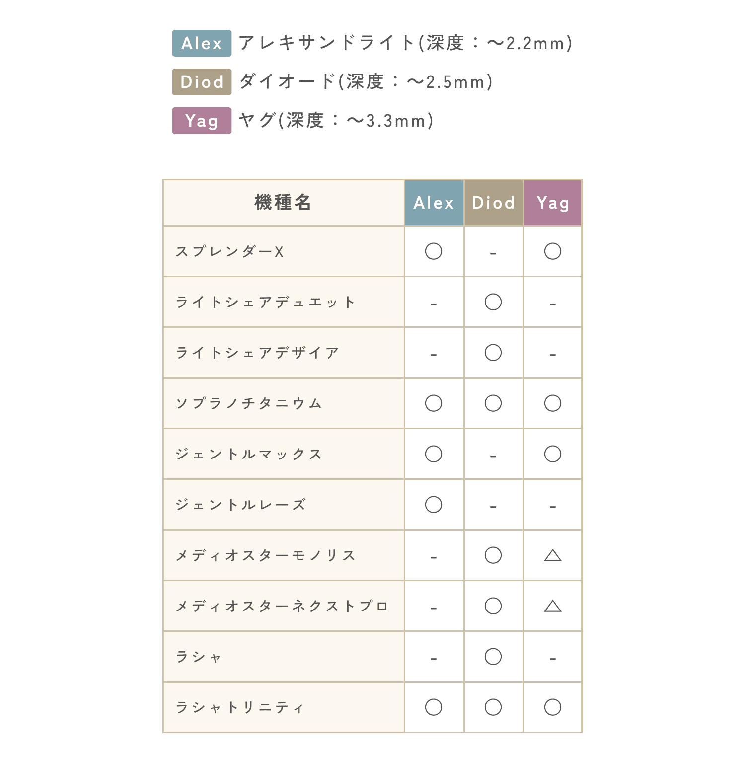 上の表にて○がひとつの脱毛機は、「単一レーザー脱毛機」です。