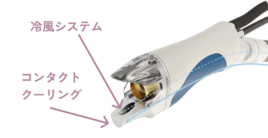 スプレンダーXは、「デュアルクーリングシステム」と呼ばれる2つの冷却機能で痛みを抑えます。コンタクトクーリングで接触部分を直接冷却し、冷風システムで風を送ることで周辺部の温度も下げます。照射部位の温度を約3度に保つことで、痛みと火傷のリスクを抑えます。