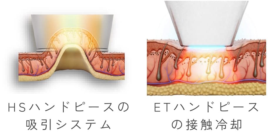 大口径のHSハンドピースは「吸引」、小口径のETハンドピースは「冷却」。それぞれの機構に合わせた方法で、痛みや火傷リスクを緩和しています。