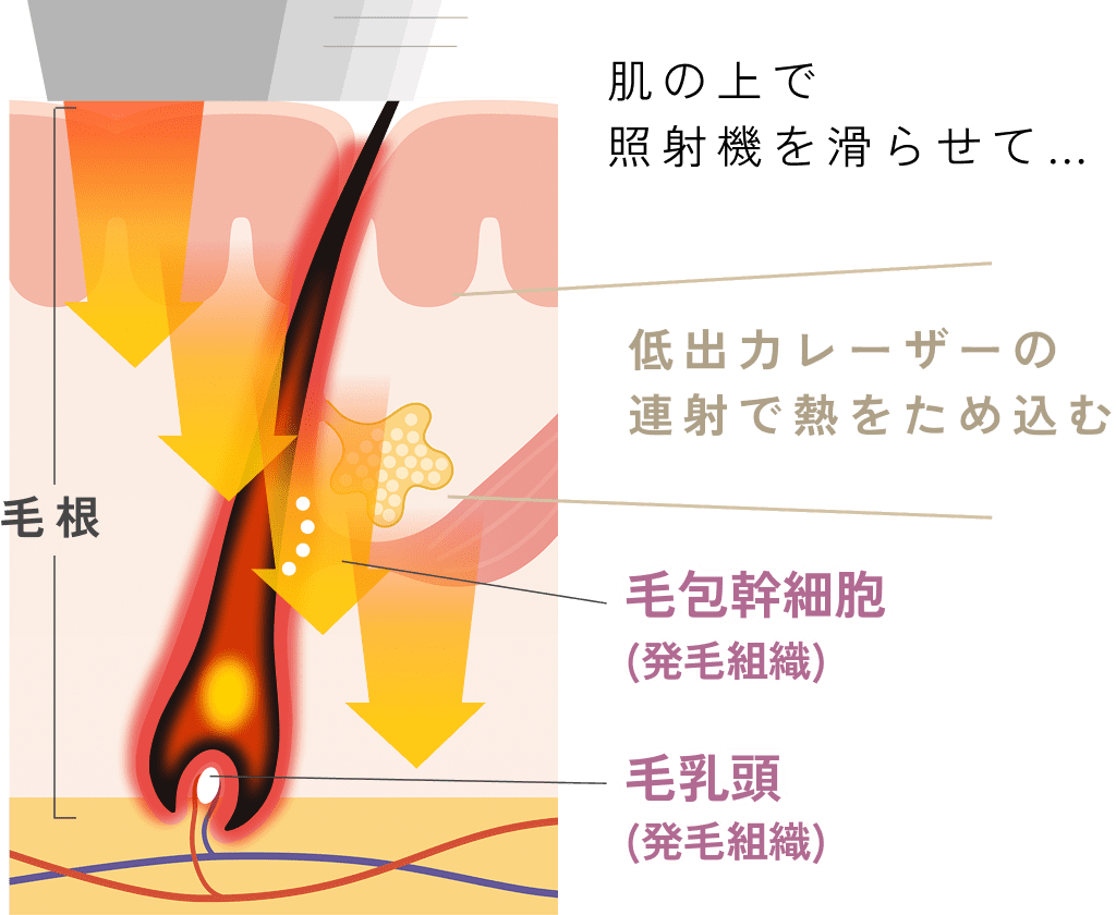 蓄熱式脱毛は、弱いレーザーを「連続で何発も」当てて、毛包幹細胞を破壊します。