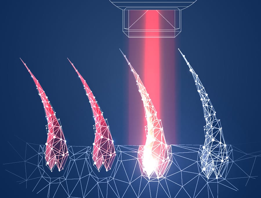 医療脱毛は、レーザーを肌に照射します。レーザーは毛に含まれるメラニン(黒色の色素)に吸収され、熱に変わり、発毛組織(毛を生み出す細胞たち)を破壊します。毛を生む細胞が無くなることで、毛が生えなくなるのです。